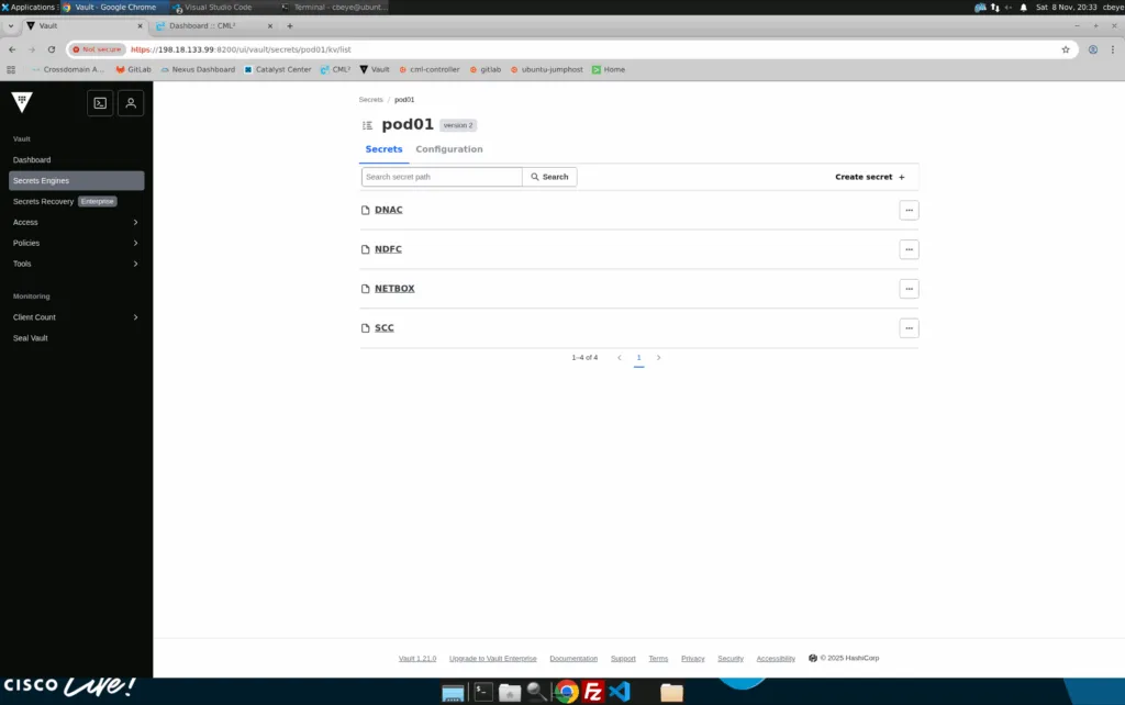 Log in to the Vault UI with your POD credentials. Select your POD secret engine. The following paths should already exist. Please explore for yourself how these variables are created and look.